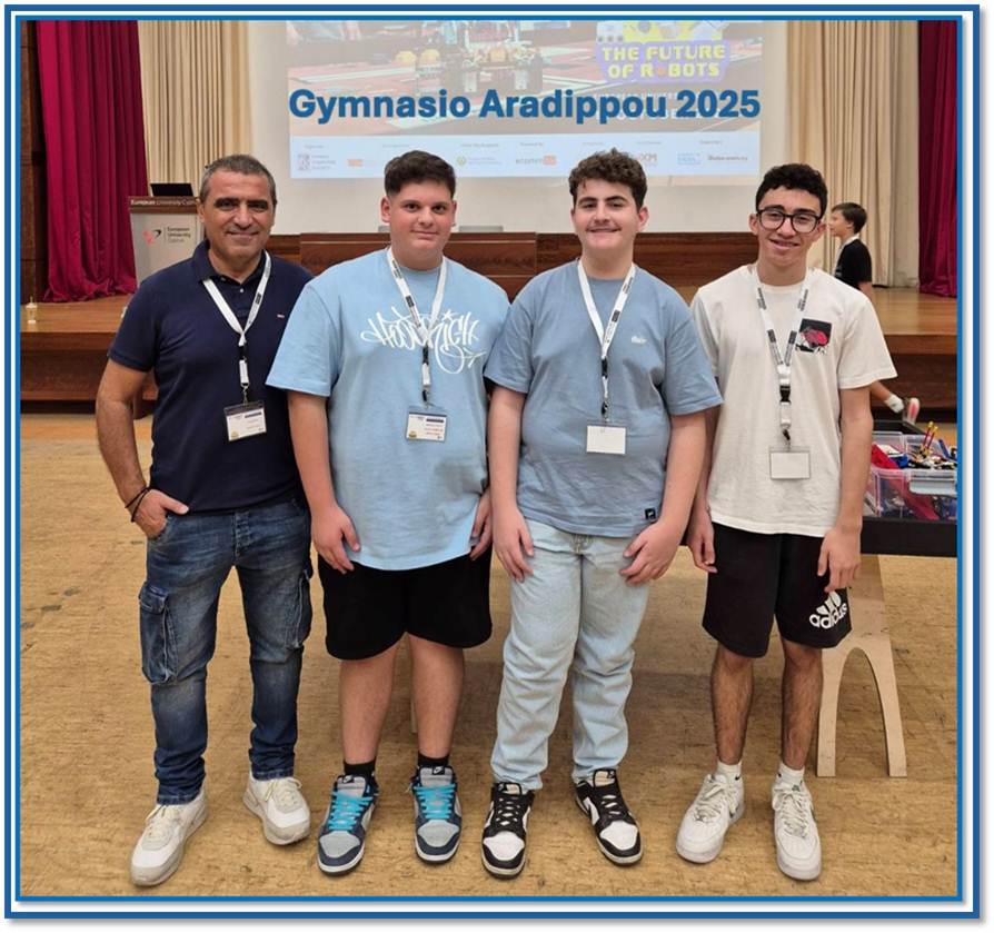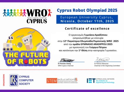 Πραγματοποιήθηκε το Σάββατο 21/10/2025 στο Ευρωπαϊκό Πανεπιστήμιο Κύπρου στη Λευκωσία, η Παγκύπρια Ολυμπιάδα Ρομποτικής WRO 2025. Το Γυμνάσιο Αραδίππου συμμετείχε στον διαγωνισμό με την ομάδα «GYMNASIO ARADIPPOU 2025», εξασφαλίζοντας την 1η Θέση και θα εκπροσωπήσει την Κύπρο στην Παγκόσμια Ολυμπιάδα Ρομποτικής WRO 2025 (World Robot Olympiad) , που θα διεξαχθεί στην Σινγκαπούρη στις 26-28 Νοεμβρίου 2025.