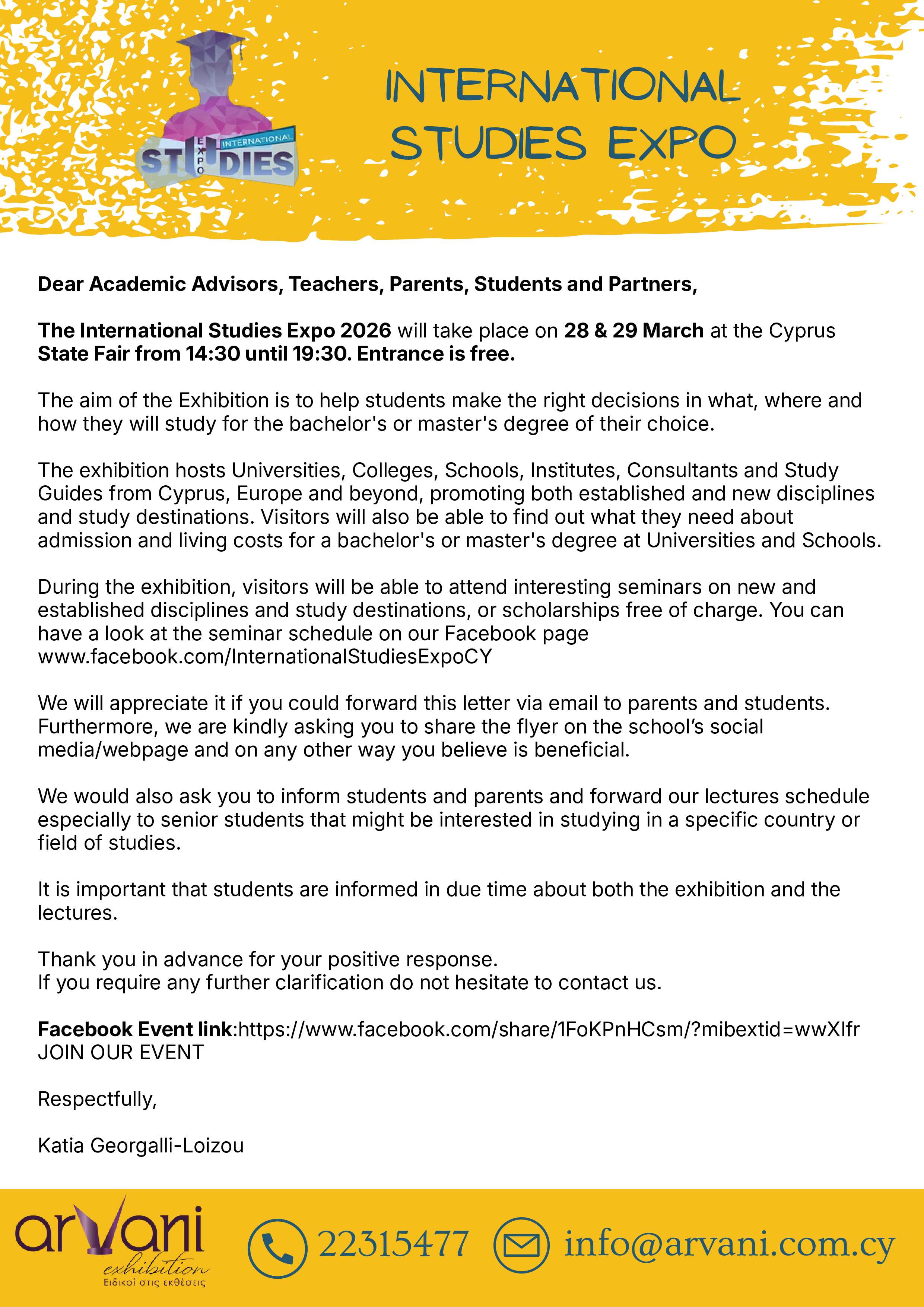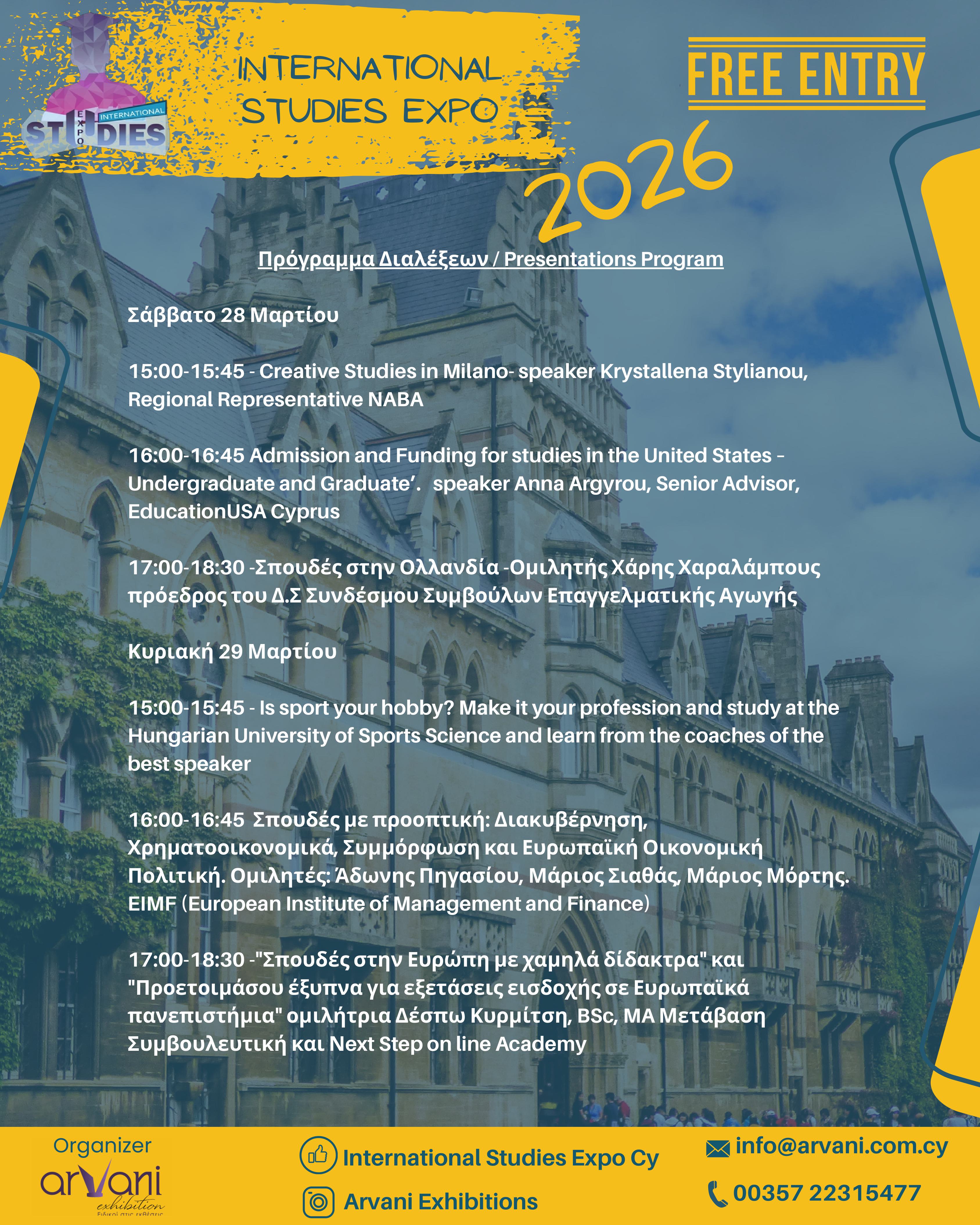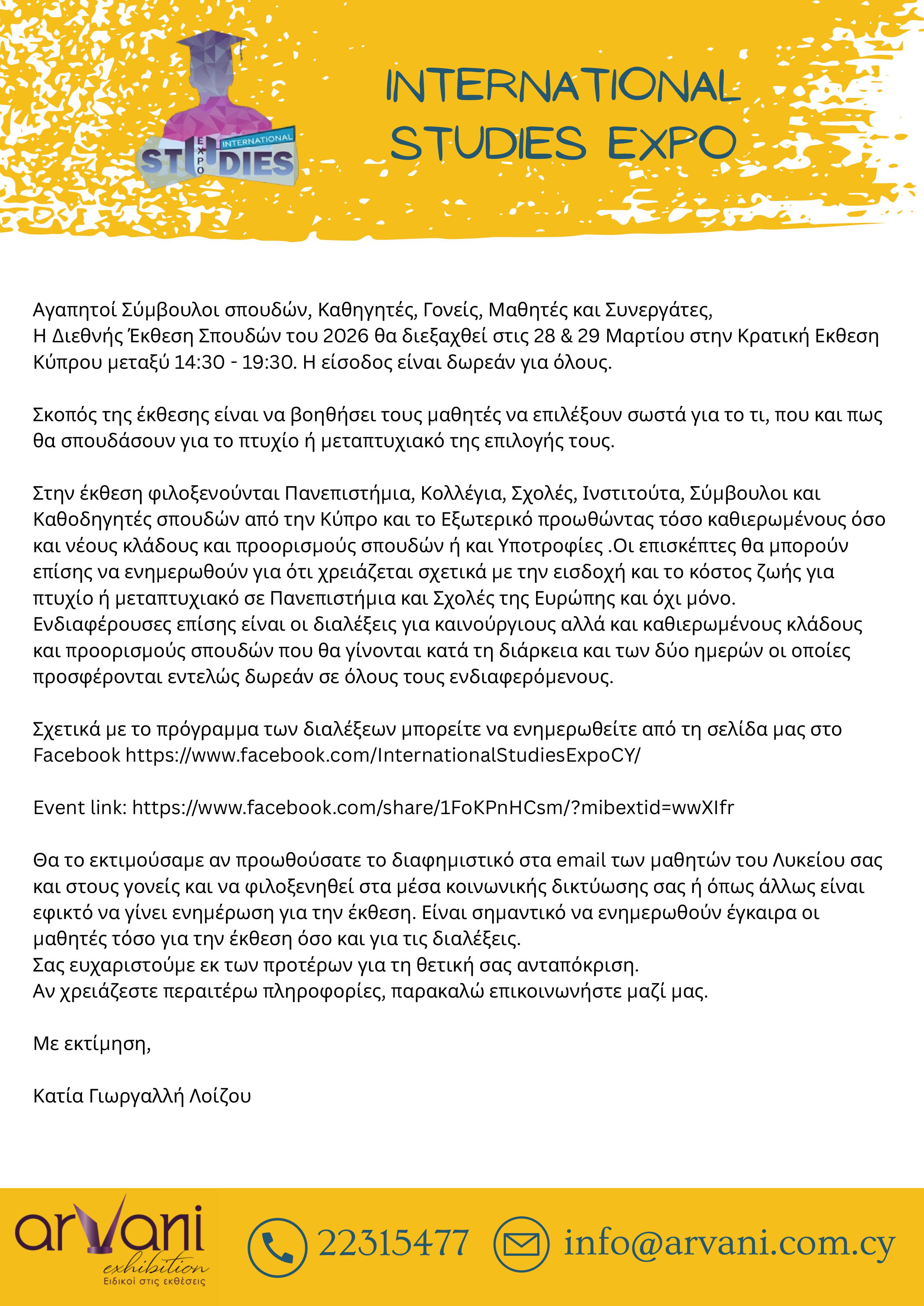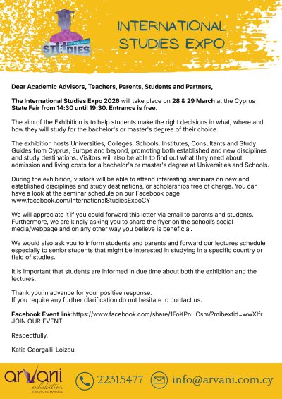 Η Διεθνής Έκθεση Σπουδών του 2026 θα διεξαχθεί στις 28 & 29 Μαρτίου στην Κρατική Εκθεση Κύπρου μεταξύ 14:30 - 19:30.