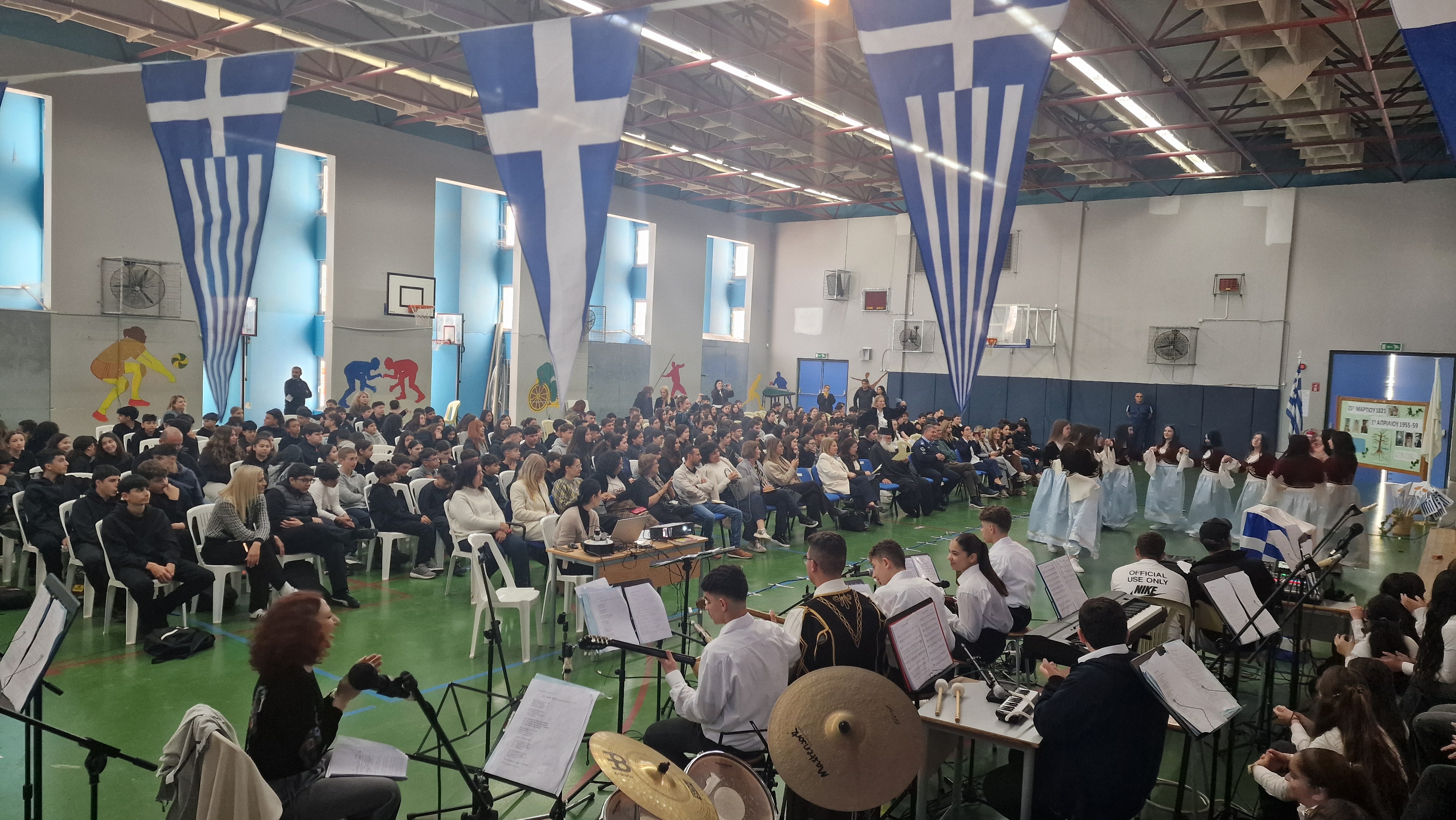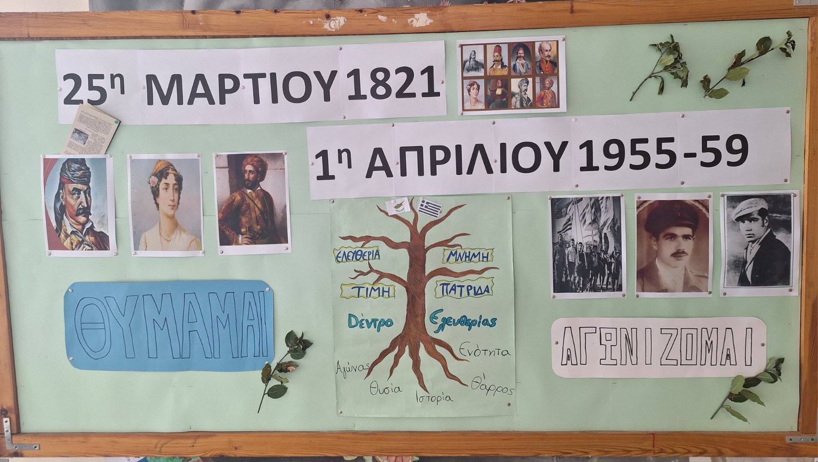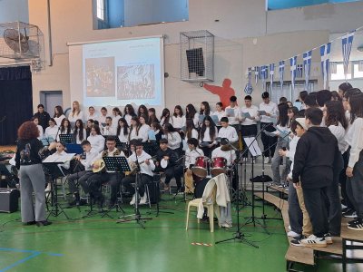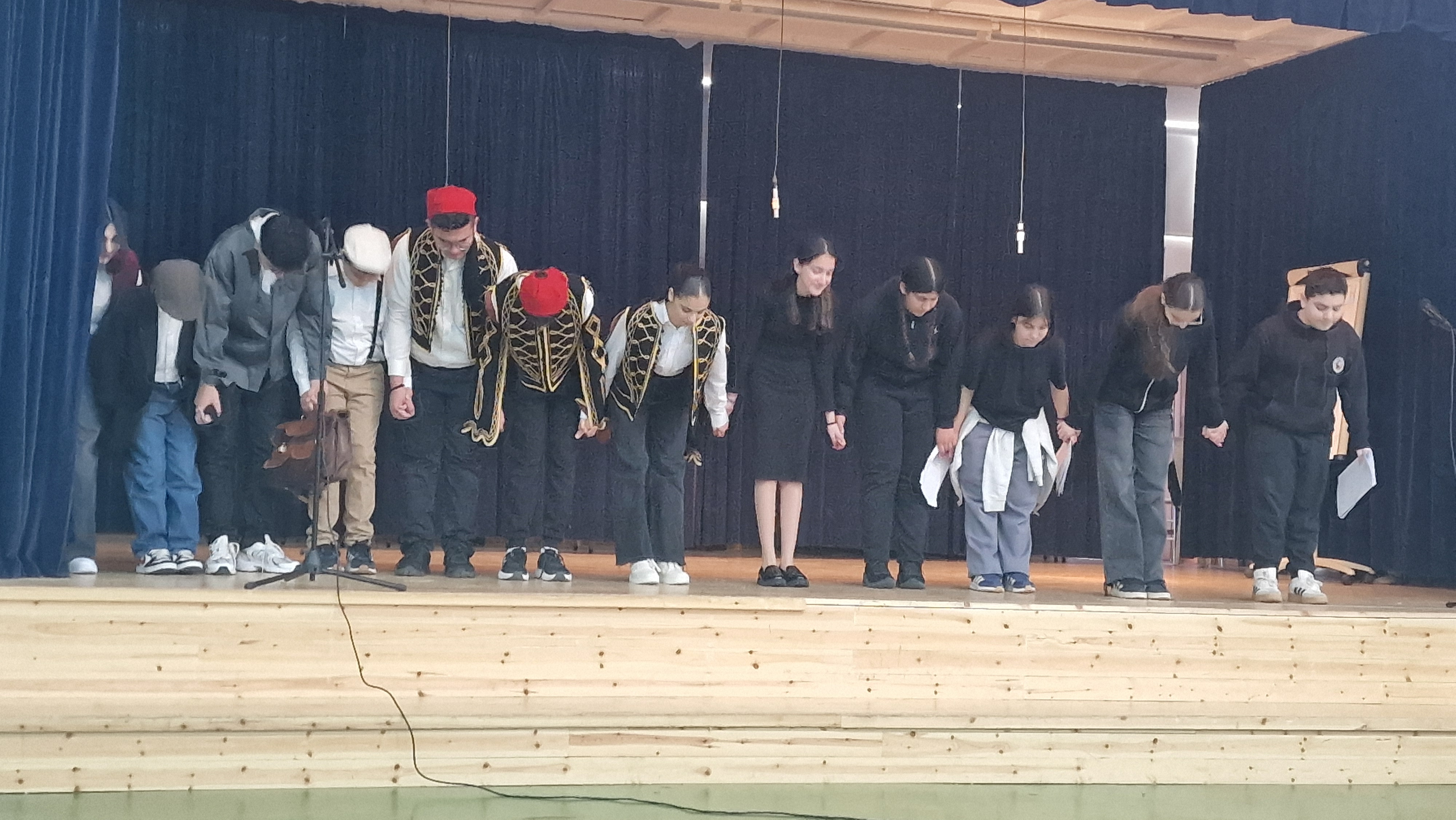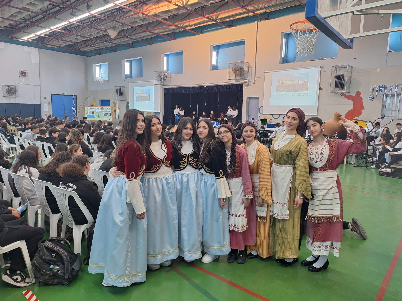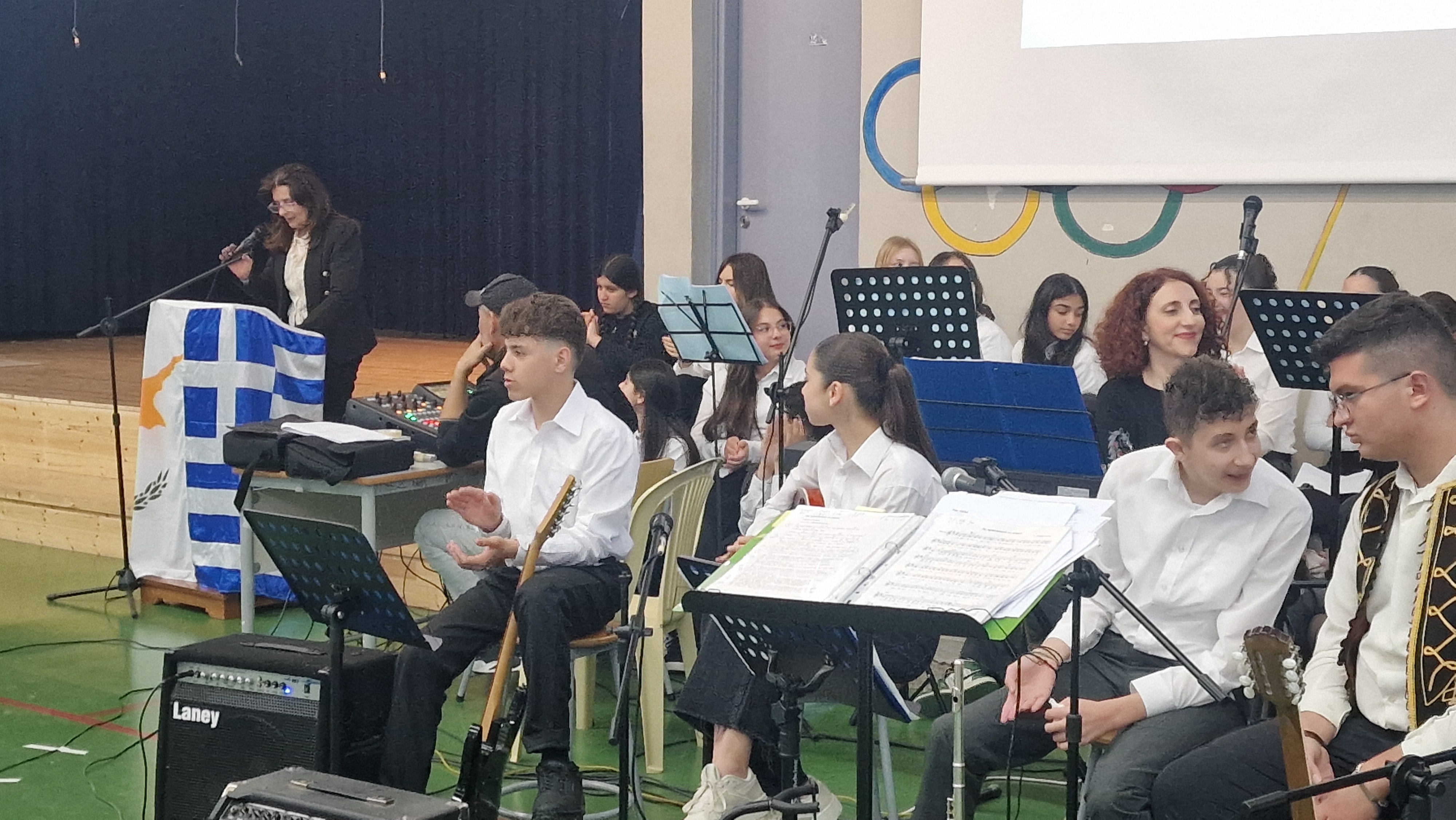 Αυτό προσπάθησαν να αναδείξουν οι μαθητές και οι μαθήτριές μας, που συμμετείχαν στην κοινή εκδήλωση των δύο αυτών Εθνικών Επετείων, που έφερε τον τίτλο: «Από το ένδοξο ΄21 στο ηρωικό ΄55-59. Σήμερα…ημέρα μηδέν». Απέδωσαν με έναν πρωτότυπο και συμβολικό τρόπο τη σημασία των δύο Εθνικών Επετείων με δρώμενο, που διανθιζόταν με αφηγήσεις και ποιήματα. Στο δρώμενο παρεμβάλλονταν χοροί και τραγούδια από τη χορευτική ομάδα και από τη χορωδία και την ορχήστρα του σχολείου μας αντίστοιχα, προσδίδοντας έναν ιδιαίτερο χαρακτήρα. Επρόκειτο για έναν μοναδικό συνδυασμό λόγου, έκφρασης, χορού, τραγουδιού και μουσικής που συνέθεταν μία αρμονική εικόνα, προβάλλοντας με ευαισθησία και δύναμη τα διαχρονικά νοήματα των Εθνικών αυτών Επετείων.